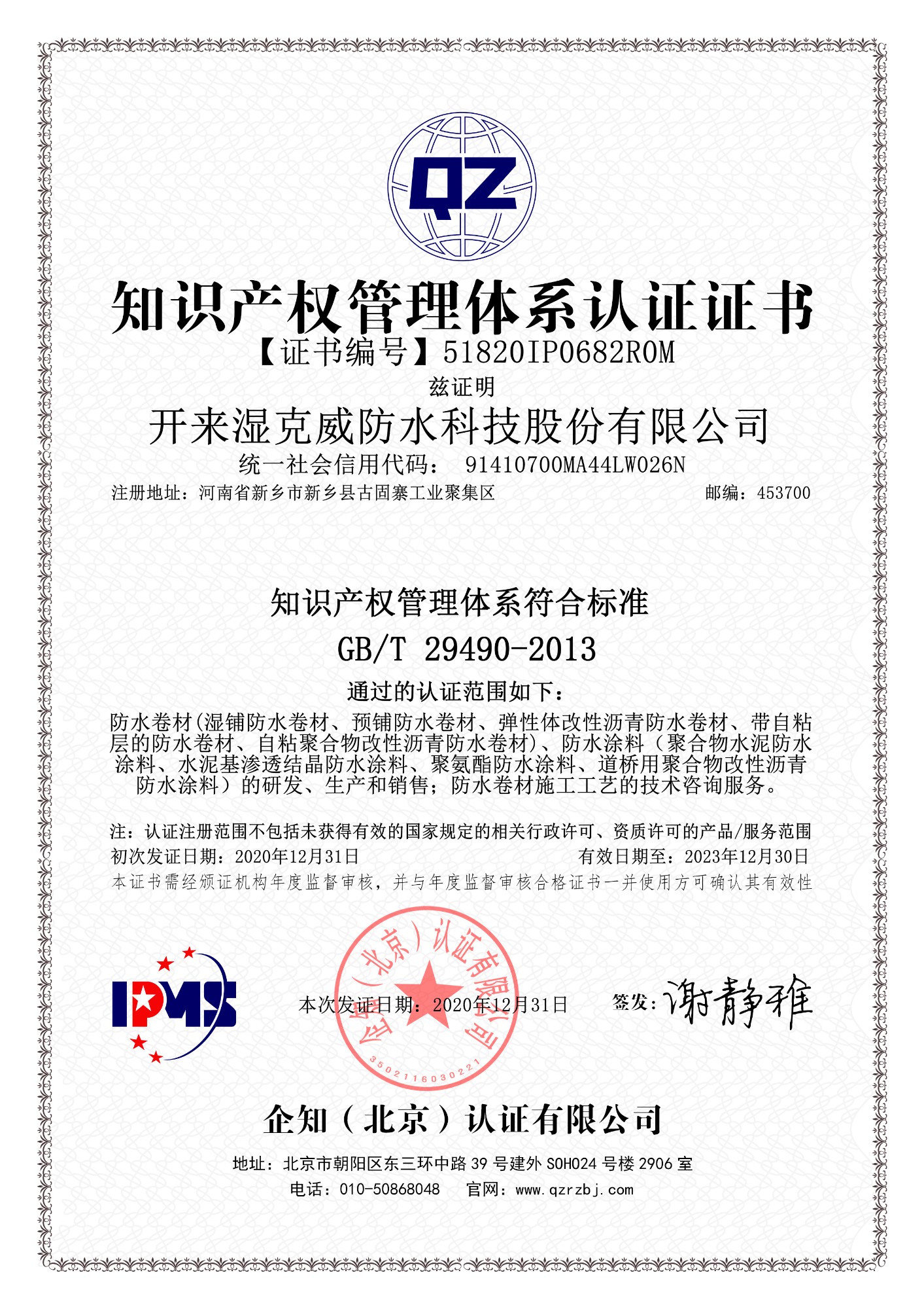 知識(shí)產(chǎn)權(quán)管理體系認(rèn)證證書