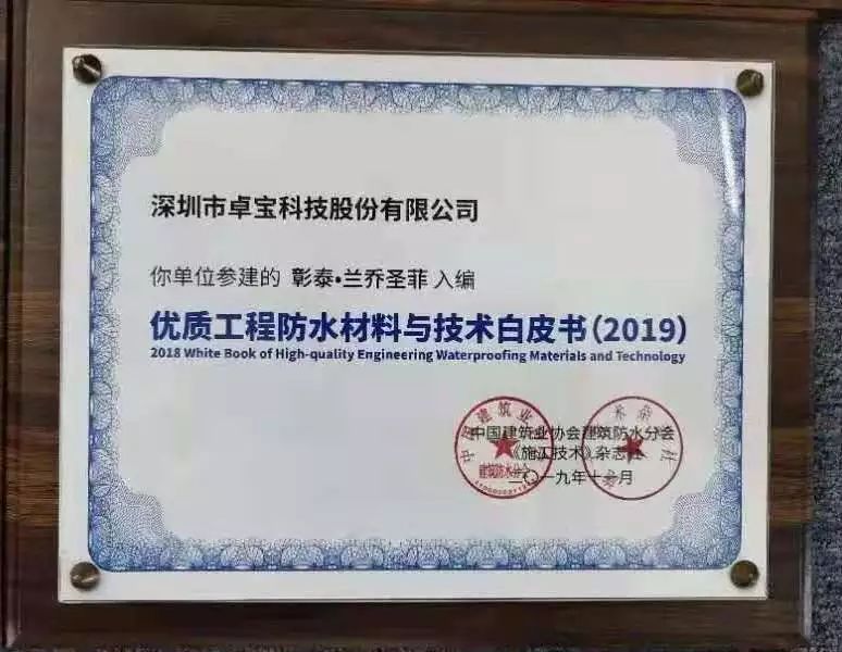 據悉,《優質工程防水材料與技術白皮書(2019版)》的編撰采取企業自愿申報、協會審核、專家遴選的形式,匯集優質防水工程材料與技術成果。該書作為促進行業技術進步的重要載體,匯集了一批優質防水工程材料與技術成果,此次的入選是對卓寶施工質量的認可。