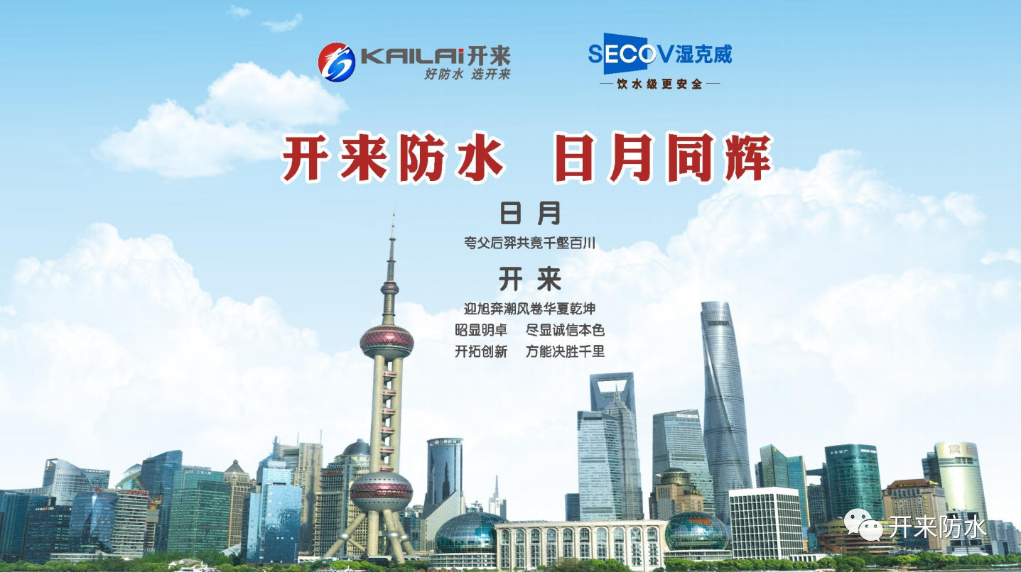 上海開來濕克威防水,始建于上海1993年,擁有華東和華中兩大研發、生產基地,旗下有開來、SECOV濕克威、樂活、一寧四大品牌,一級資質,網絡覆蓋600座城市,出口日本、俄羅斯、越南、柬埔寨、科威特、吉布提、香港、澳門等國家地區。我們以呵護人類建筑安全為己任,通過“一個電話所有事情我來辦”和“360°品控,全程品質可追溯”來踐行防水全程無憂。